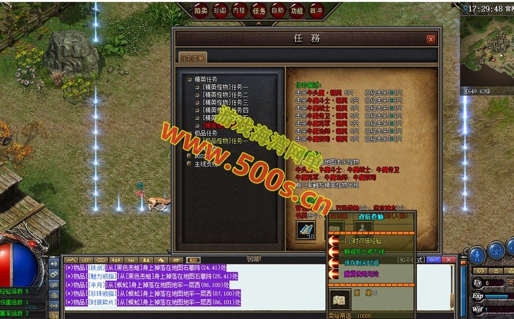 武器必成卷和衣服必成卷,内功经验卷轴,神石,盾牌,全套时装首饰等。【各种稀有怪物爆出】